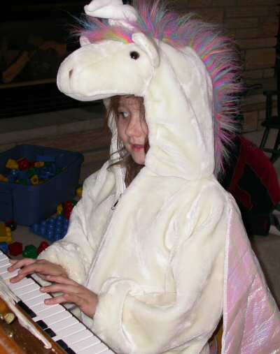 Here’s Rianna the Flying Unicorn, playing “Happy Birthday” for her mother: